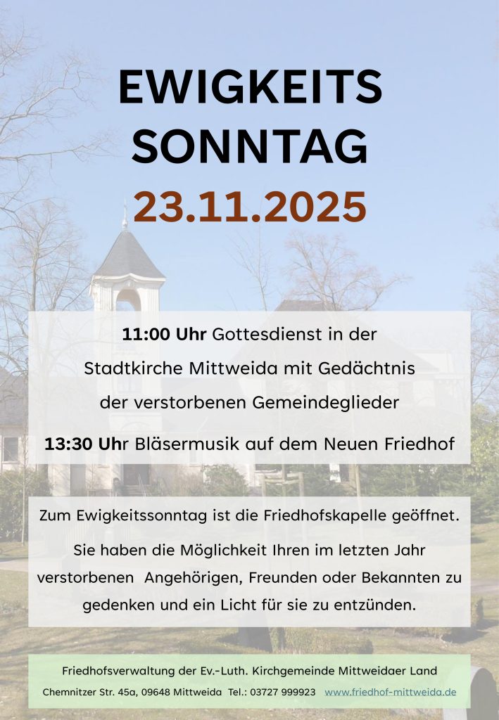 Zu diesem besonderen Gedenktag spielt der Posaunenchor der Kirchgemeinde Mittweida von 13:30 Uhr bis 14:00 Uhr auf dem Neuen Friedhof in Mittweida. Die Friedhofskapelle ist ebenfalls geöffnet und es kann eine Kerze für einen verstorbenen Angehörigen entzündet werden.
