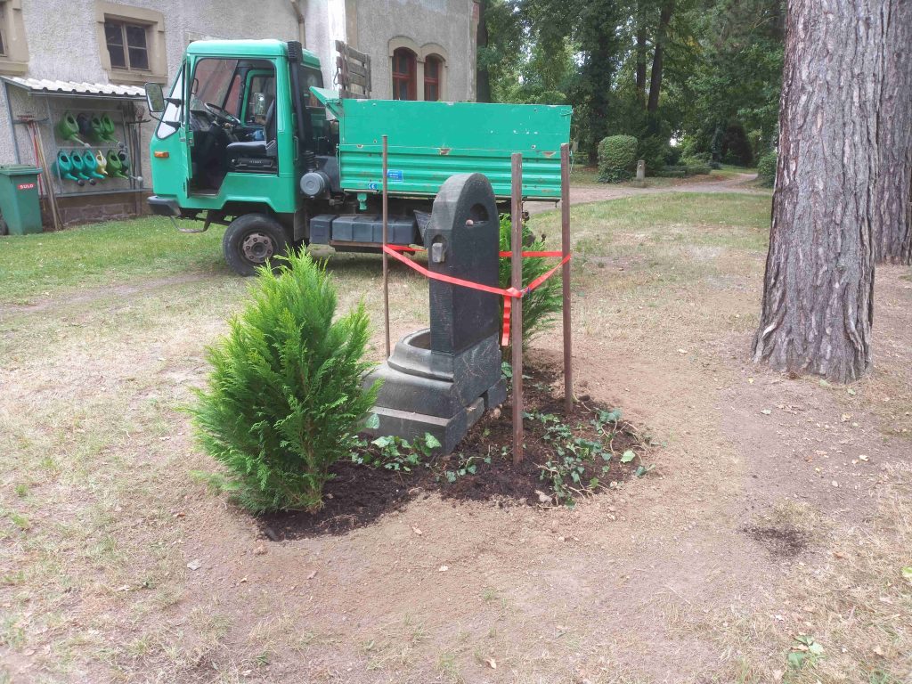 Auf Betreiben der Ur-Urenkelin des dort beigesetzten Müllers Carl Friedrich Pönisch konnten Grabstein und Bepflanzung wieder hergerichtet werden.
